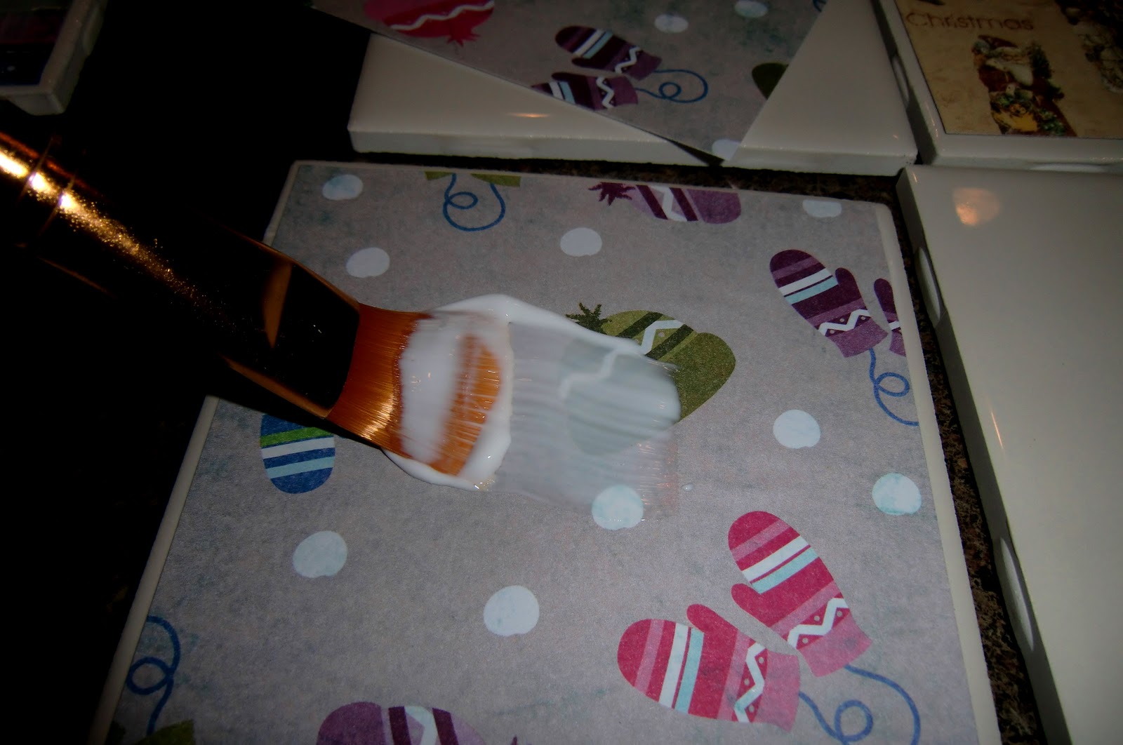 Liberally apply your Mod Podge to the top of your tile.  (one at a time...you don't want it to dry to fast!)