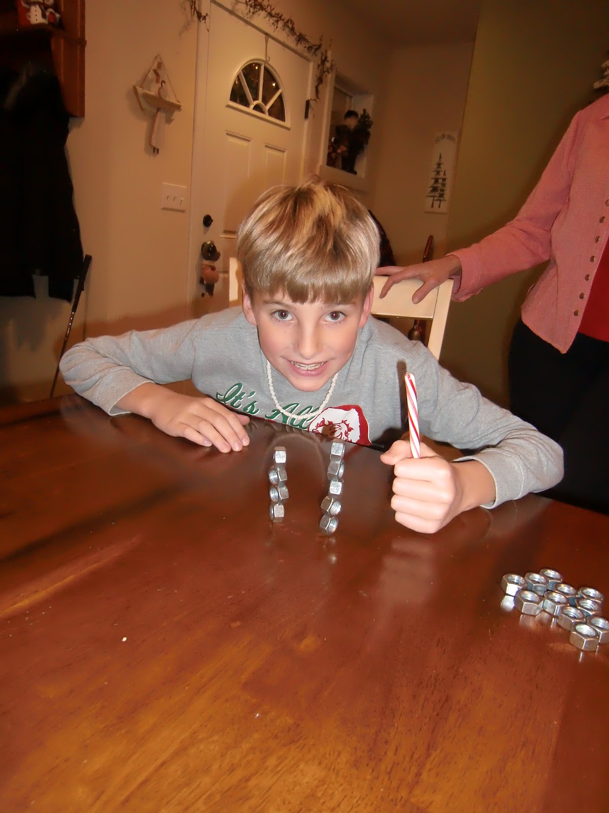 Using only one hand and a candy cane, stack the nuts on top of one another: 3 stacks of 5!